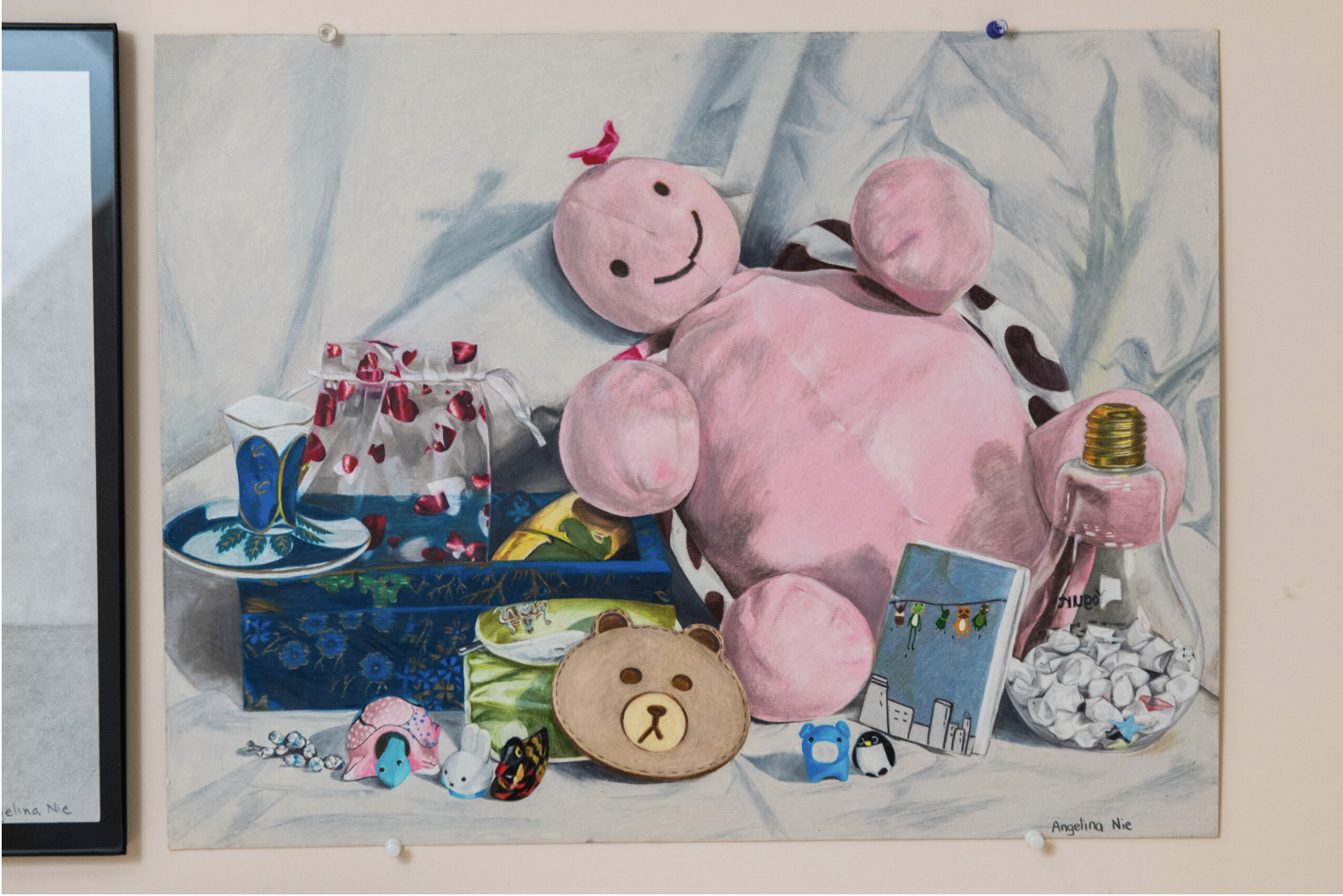 Nie says she’s most proud of the work she’s created for her studio art class at school, including a graphite drawing of a hand as well as a colorful pencil drawing of things that are meaningful to her (a stuffed animal, a lightbulb, etc.). For Nie, completing a piece of art is rewarding. “I was able to realize the vision I had in my mind,” she explains. “I used photographs for reference, so I was really proud when they were pretty similar. That’s a skill that took a long time to develop.” And, Nie says, she’s also developed techniques like sketching without using a grid. Her graphite hand drawing, which features several fingers clenched around a small square, was one of her first gridless attempts. “I was proud I didn’t need to grid it while others in the class did,” she explains. “Gridding definitely makes life a lot easier, but it’s a skill to map out the proportions without it, so it’s something worth feeling proud of.”
